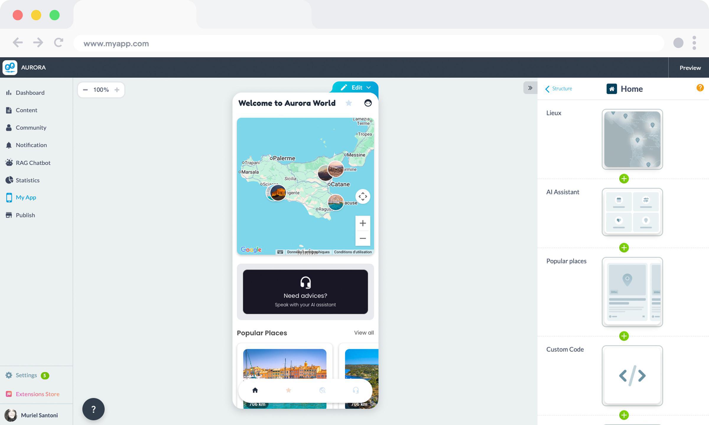 En el caso de AURORA, sólo utilizamos los bloques de construcción que resultaron útiles para este proyecto: cuentas de usuario, marcadores, notificaciones, compras dentro de la aplicación, código personalizado y la sección RAG. Obviamente, esta lista no resume todo lo que GoodBarber puede ofrecer. Simplemente se corresponde con el alcance del briefing.