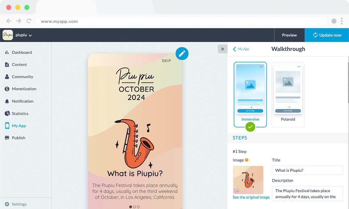 Para activar la Guía Interactiva, ve a la Extension Store y busca la extensión de Guía Interactiva. Se crea un nuevo panel de edición en el menú Mi App > Guía Interactiva. ¡Solo tienes que elegir tu plantilla y crear los pasos de tu guía!