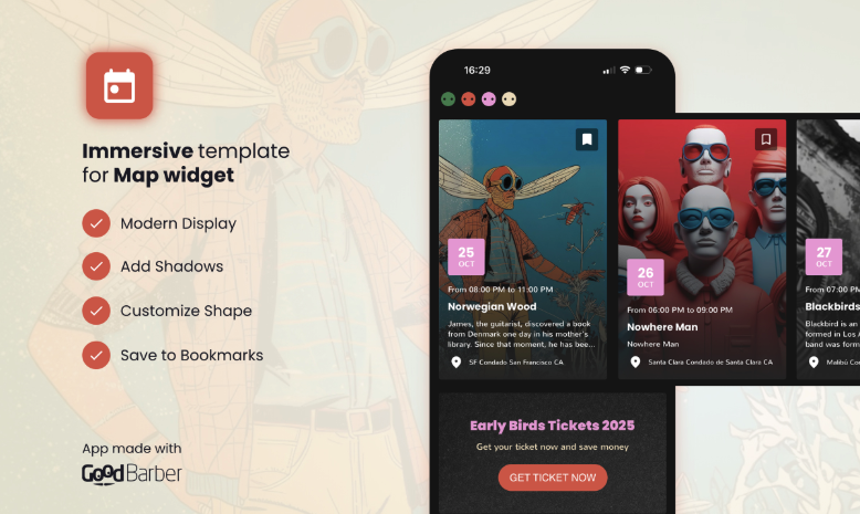 La plantilla Immersive Card Banner, ya popular para los widgets de mapas , está ahora disponible para los widgets de calendario. Muestre sus eventos de forma elegante y dinámica, gracias a una interfaz moderna y opciones de personalización diseñadas para cautivar a sus usuarios.