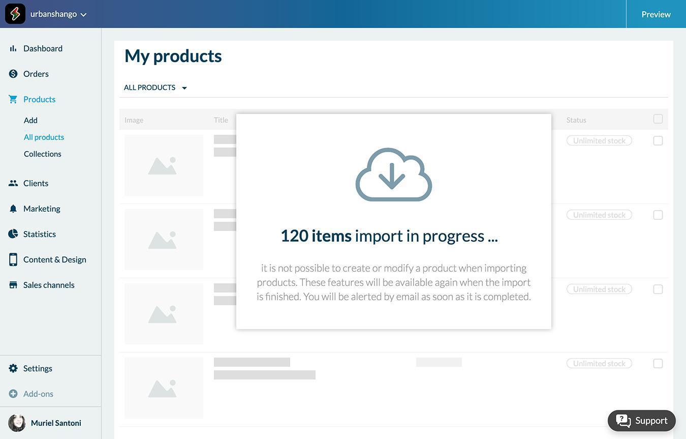 En tu back office, ve al Menú de productos> Todos los productos. En la esquina superior derecha de la pantalla, haz clic en "Importar" para seleccionar tu archivo .csv que contiene tus productos y sus características.