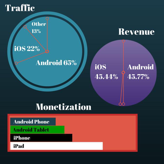 Según el informe Opera MediaWorks más reciente, Android incrementó su porcentaje de tráfico de forma más significante que iOS en 2014 y esta tendencia ha continuado en el primer cuatrimestre de 2015 (65% Android y 22% iOS, según número de impresiones). Dado que los dispositivos Android han experimentado un crecimiento mayor de su tráfico, también ha sido mayor el crecimiento de sus beneficios. No obstante, el valor de éstos no es nominal (menor del 5%).