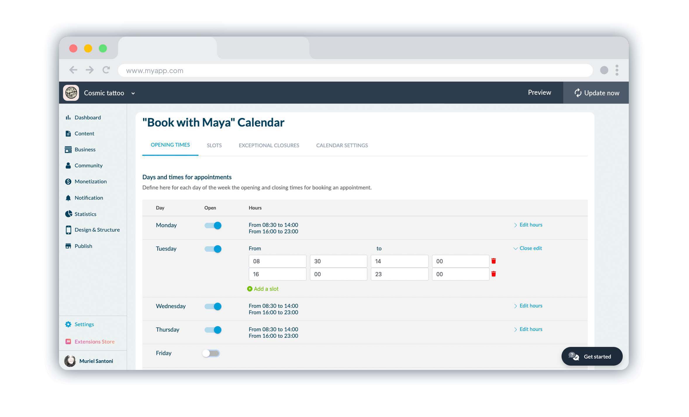 - Horario de atención: seleccionas los días y horarios en los que tus clientes pueden concertar citas. Puedes habilitar o deshabilitar días completos y crear intervalos de tiempo para cada día.