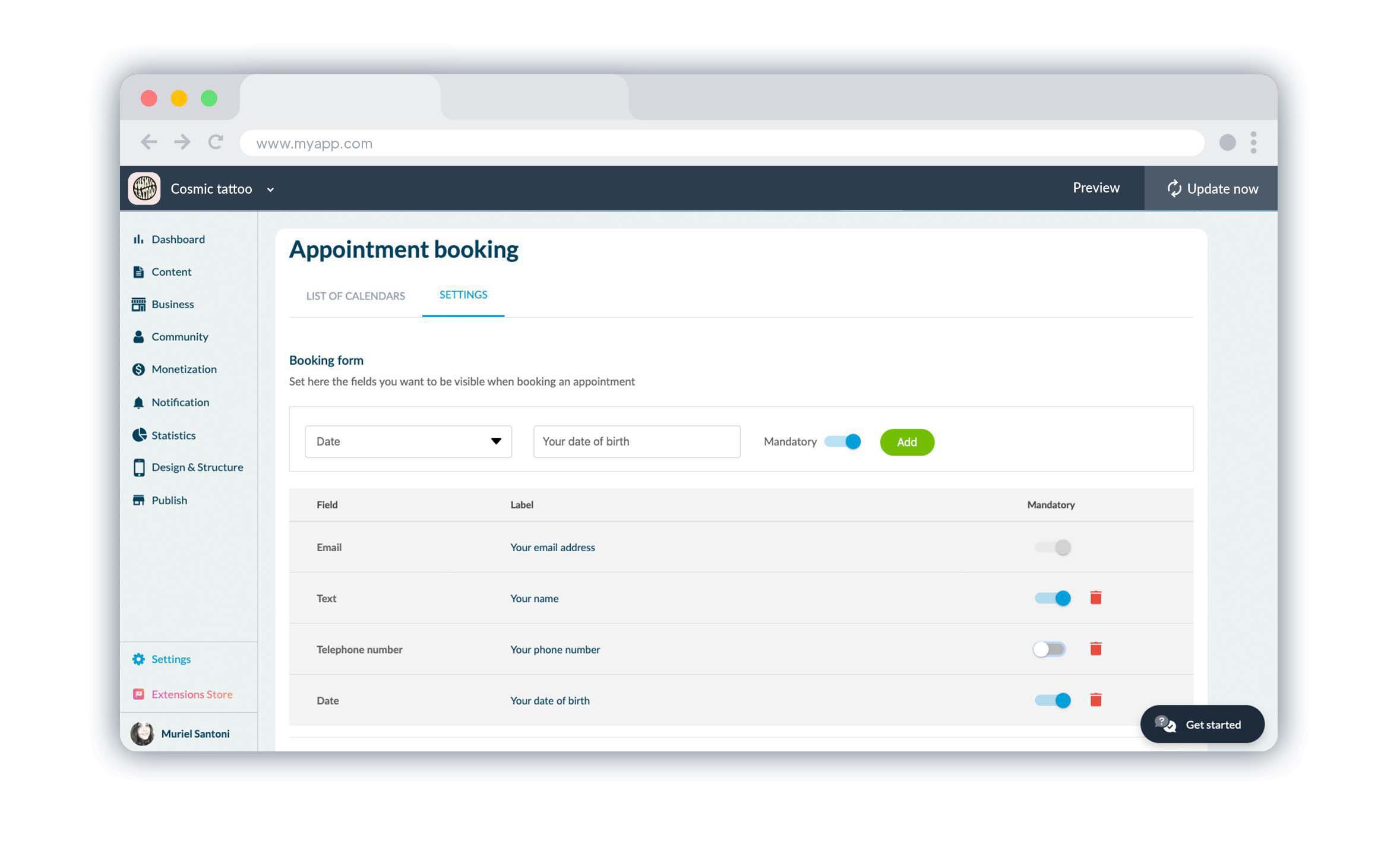 Tienes control sobre cada paso del proceso de citas. Desde tu back office, puedes personalizar el formulario que tus clientes tendrán que rellenar para concertar una cita. Hay varios tipos de campos disponibles para permitirte recopilar la información que necesitas: enlace, fecha, correo electrónico, texto, número de teléfono... elige tus campos, tu redacción y decide hacerlos obligatorios o no.