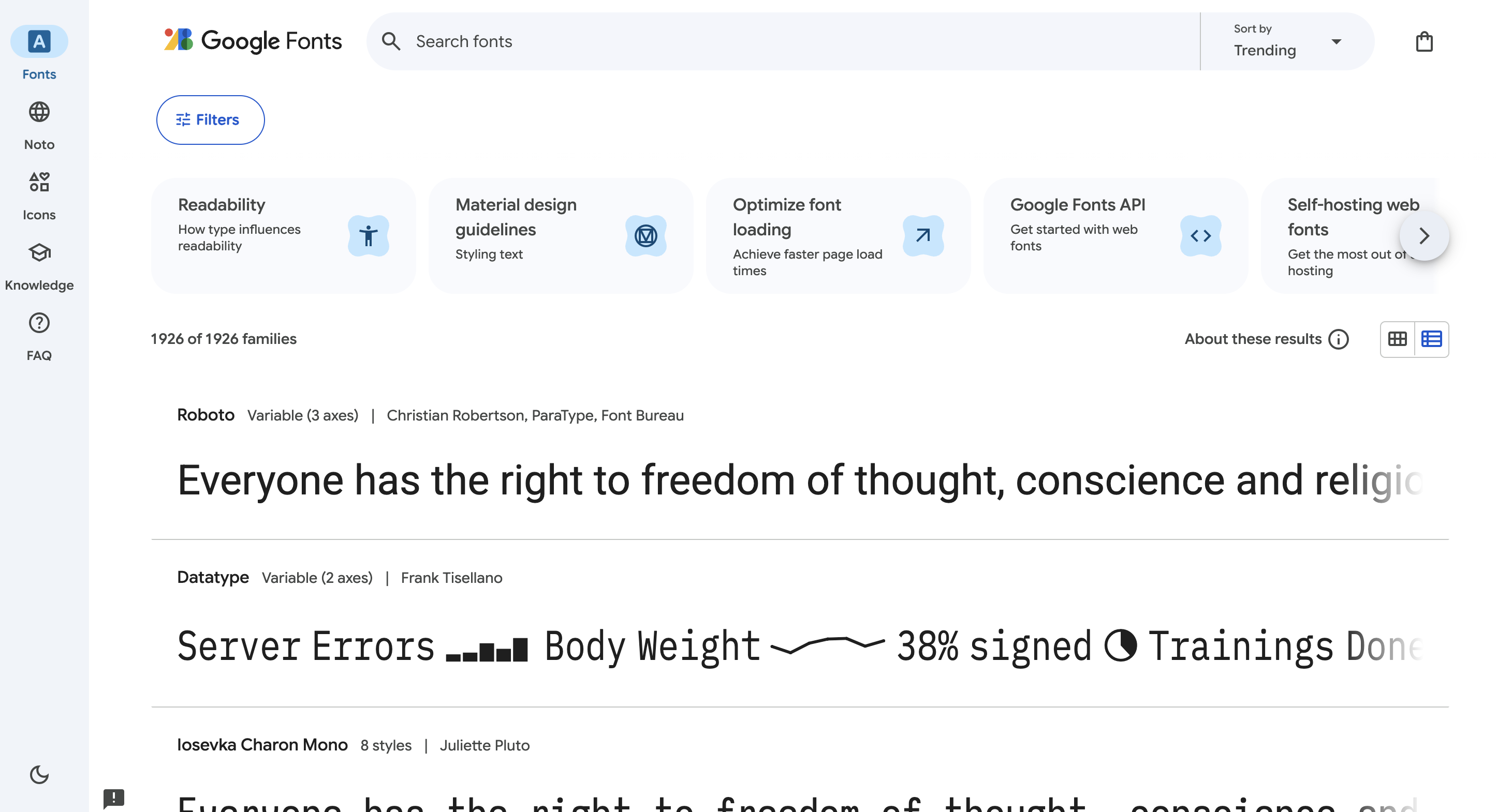 Google Fonts La referencia definitiva para fuentes gratuitas. Google Fonts ofrece cientos de familias de fuentes de código abierto, compatibles con más de 135 idiomas. Puede clasificar las fuentes por popularidad, estilo, peso o sistema de escritura, y previsualizar sus textos antes de descargarlos. Todas las fuentes son de uso gratuito, incluso para proyectos comerciales.