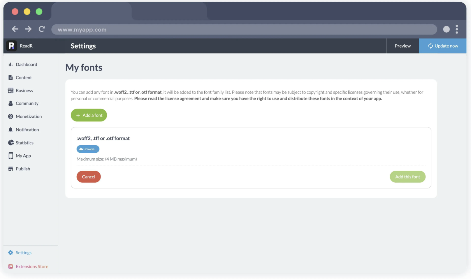 Puede importar sus fuentes en los formatos requeridos (.woff2 para aplicaciones web progresivas, .ttf u .otf para aplicaciones nativas). Puede incluir hasta diez fuentes personalizadas. Una vez añadidas, estas fuentes estarán disponibles en todos los selectores de fuentes de su interfaz de administración.