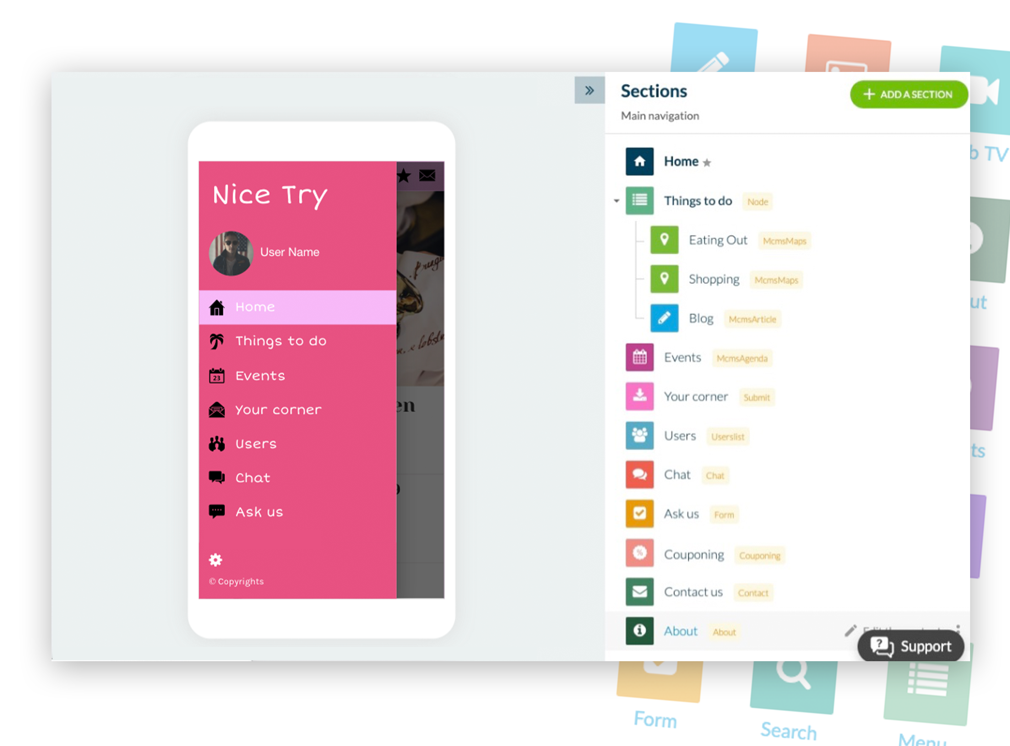 Es una sección que contiene otras secciones. Se utiliza como elemento de navegación en la aplicación. Esa es la razón por la que, en términos de diseño, hay muchos parámetros disponibles para esta sección. Es muy versátil. Úsalo con sabiduría. Si coloca muchos de ellos en su aplicación, y si para cada uno de ellos ha configurado una imagen de fondo en lugar de un color sólido para acceder a las subsecciones, el peso será muy alto. Da un paso atrás y encuentra una forma más inteligente de organizar tu aplicación.