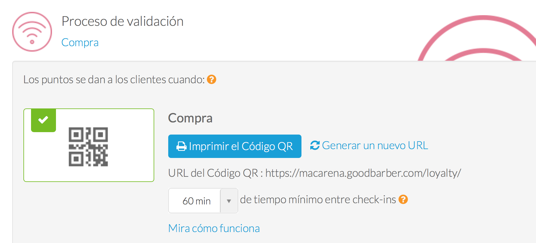 Y si ya eres usuario y quieres aplicar estos nuevos cambios a tu código QR, tienes que ir al back office de tu app y (en el menú Negocios > Fidelización> Tarjeta > Proceso de validación> Compra) desde allí podrás crear un nuevo enlace para tu código QR.
