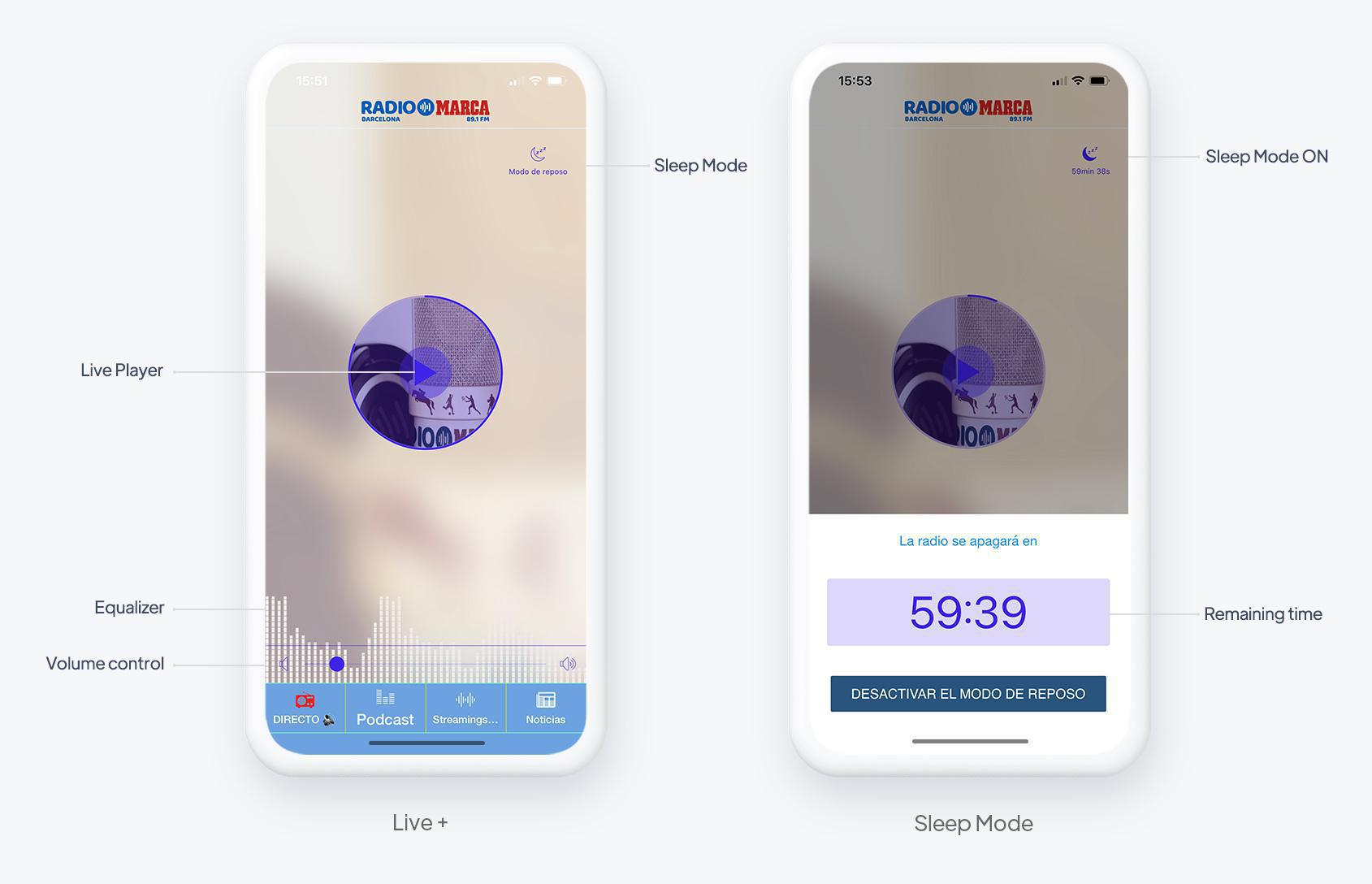 Entre todas las funcionalidades propuestas en su aplicación, a Radio Marca Barcelona le gusta mucho la sección Live +, combinada con la opción del modo de reposo . Live + permite a Radio Marca Barcelona mostrar, en tiempo real, la información relacionada con el programa que está escuchando el usuario.