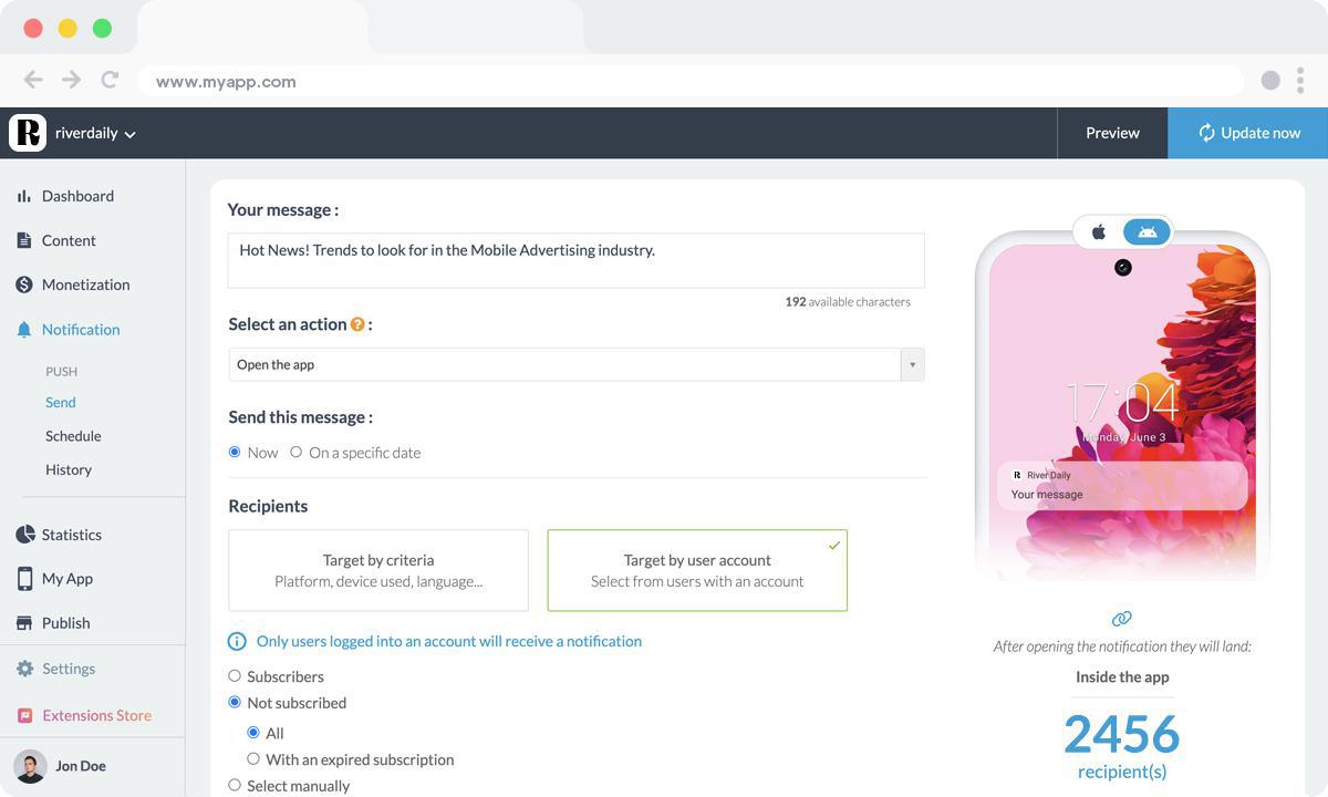 La retención de suscriptores es crucial para la rentabilidad de tu aplicación. Cuando la suscripción de un usuario está a punto de vencer, puedes enviarle una notificación push para recordarle los beneficios de la suscripción, animándolos así a renovar su membresía. Esta es una método poderoso para retener tu base de usuarios de pago.