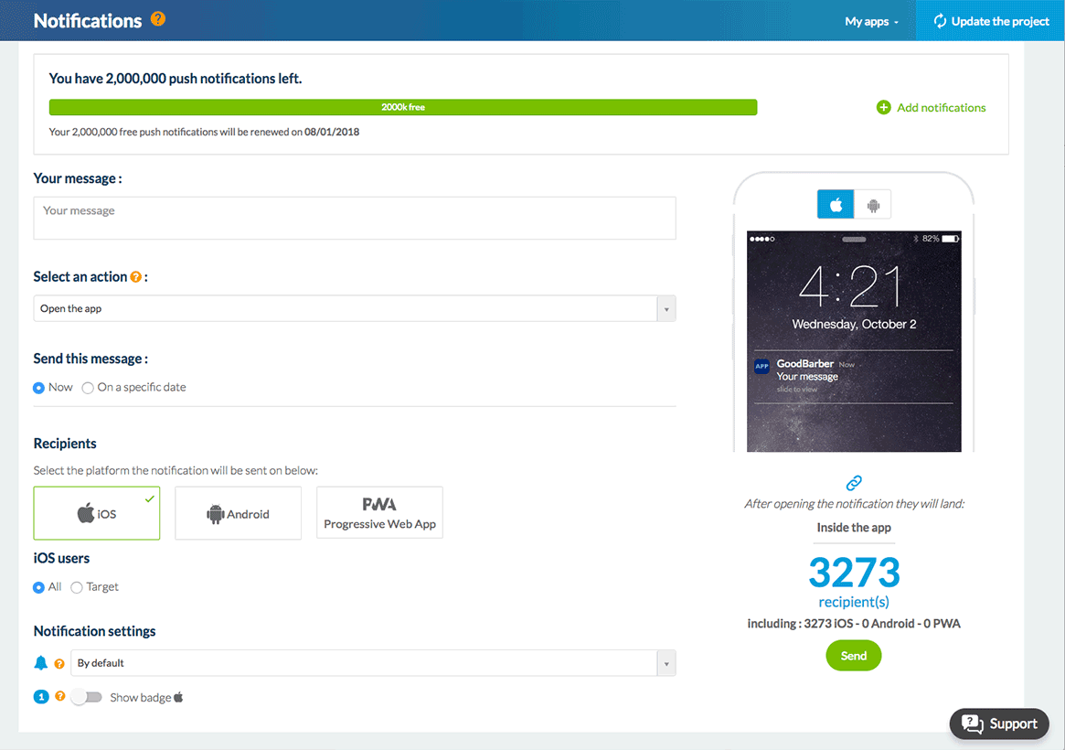 Si has suscrito a una oferta nativa GoodBarber y que has activado la versión PWA de tu app, tendrás entonces la posibilidad de enviar notificaciones push a tus usuarios nativos iOS, Android y PWA. Se trata de una ventaja considerable que te permite comunicar en directo con el conjunto de tus usuarios independientemente del dispositivo que utilizan.