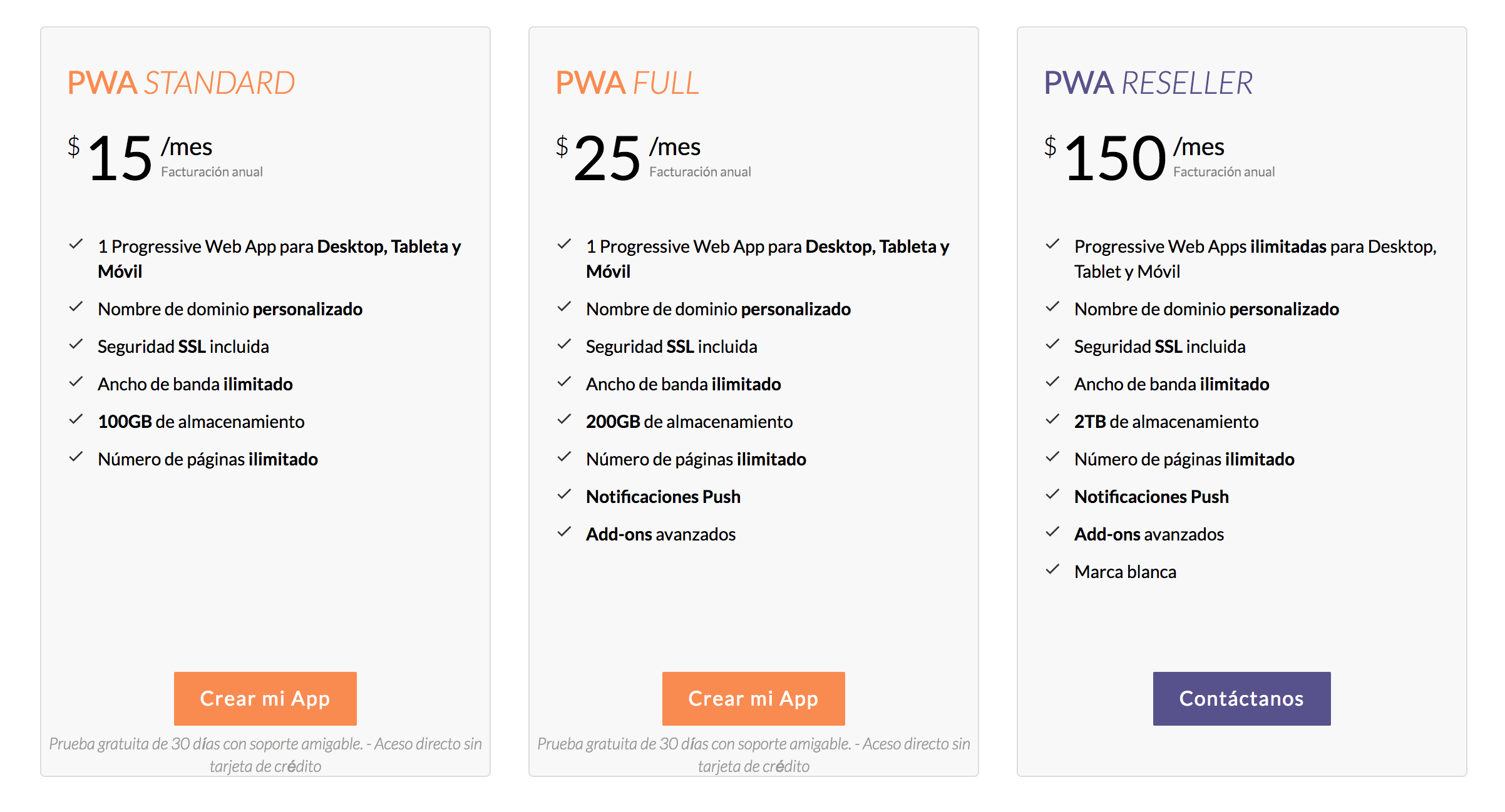 - Una línea web con 3 suscripciones que permiten crear Progressive Web Apps.