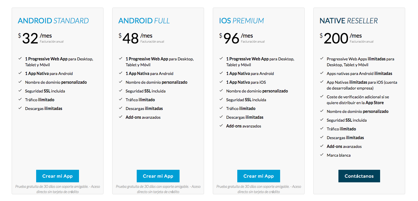 - Una línea nativa + web con 4 suscripciones para crear aplicaciones nativas (Android y iOS) y Progressive Web Apps.