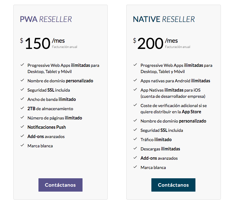 La oferta Reseller Nativa permite la creación de apps nativas Android & iOS y también la de PWA de manera ilimitada (la distribución de las apps iOS en la App Store implica costes adicionales).