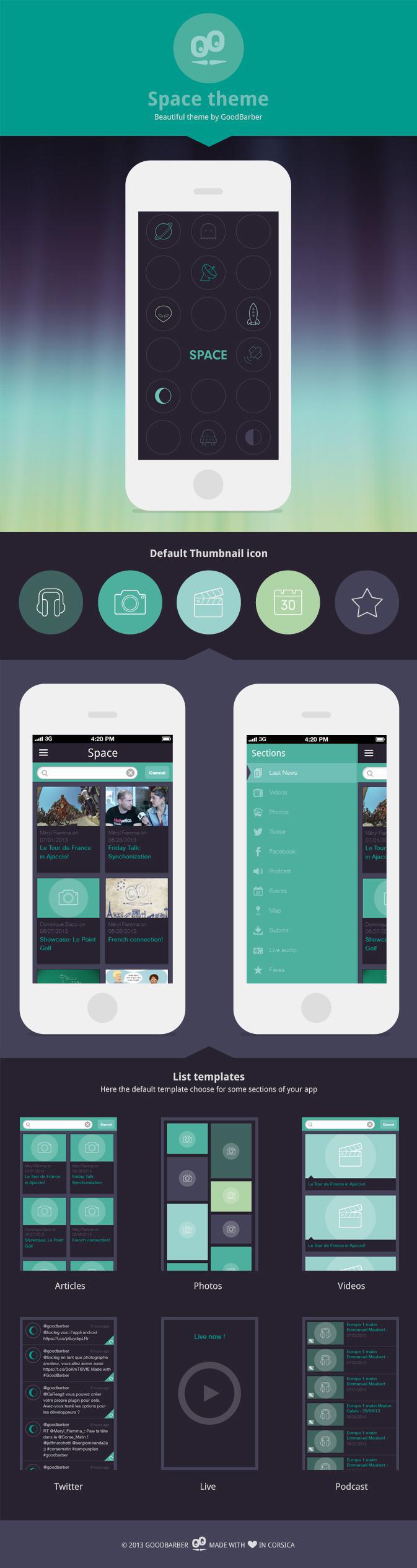 Space es uno de nuestros más de 50 temas disponibles en tu back end de GoodBarber. Utilízalo como un punto de inicio para crear tu Beautiful App