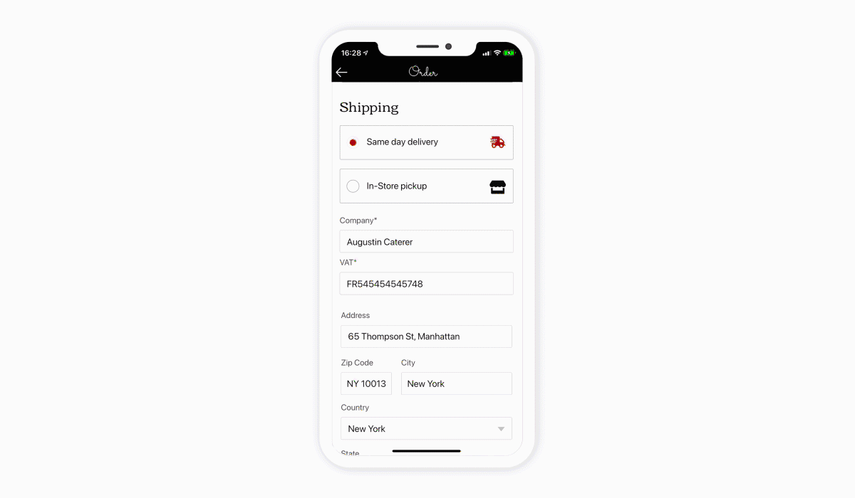 - En la página de pago, simplemente seleccionan la recogida en la tienda. Gracias al add-on Pago Rápido, no hay más información para dar ni formulario para completar. Y ven automáticamente la ubicación del restaurante en un mapa.