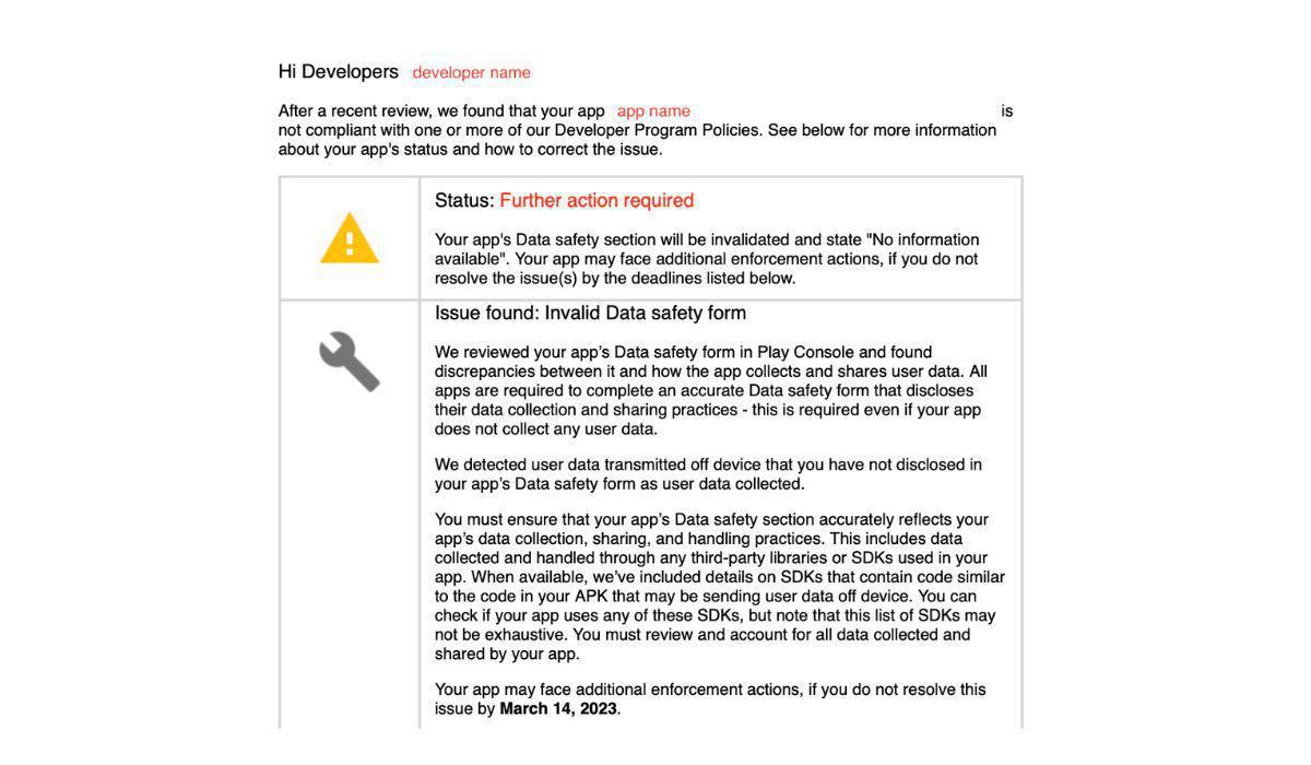 En 2021, Google anunció detalles adicionales para la sección de seguridad de los datos en Google Play. Los desarrolladores ahora deben informar a Google sobre las prácticas de privacidad y seguridad de sus aplicaciones completando un formulario en Play Console. Esta información se mostrará en la ficha de Play Store de tu aplicación para ayudar a los usuarios de Google Play a comprender cómo tu aplicación recopila y comparte los datos de los usuarios antes de descargarlos.