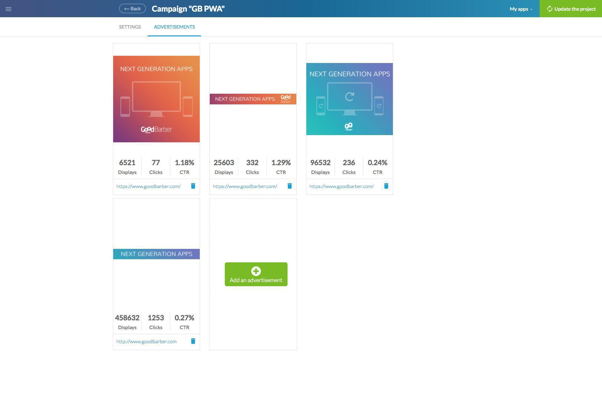 La visualización de publicidades en una página web representa una fuente de ingresos interesante cuando tienes una audiencia específica o importante. Si estás considerando monetizar el tráfico de tu Progressive Web App con campañas publicitarias, tienes varias opciones. La PWA dispone de varios espacios para mostrar tu publicidad, varios formatos y la posibilidad de conectarse a varias redes publicitarias, incluso la red de publicidad interna de GoodBarber.