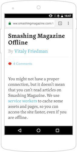 El objetivo es ofrecer la mejor experiencia de usuario posible, incluso sin conexión a Internet. Smashing Magazine permite a la app recuperar y almacenar datos en caché para que los usuarios puedan seguir navegando por la app. En el ejemplo anterior, hemos cargado un artículo y justo después hemos activado el modo avión, para estar seguros de que no teníamos ningún tipo de conexión. Cuando hemos actualizado la página, el artículo todavía estaba disponible para su lectura.