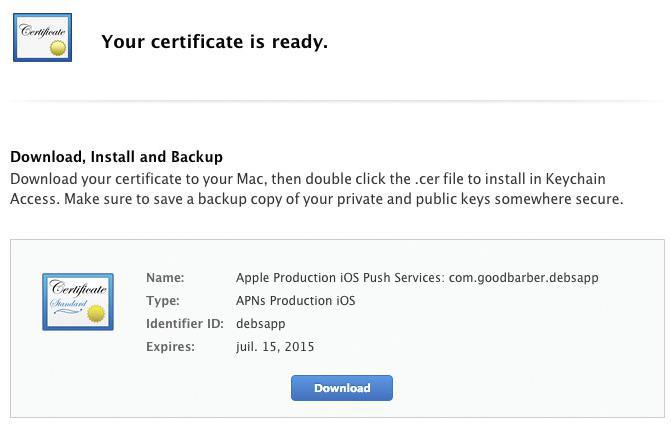 El proceso de creación es el mismo que el anterior; Tienes que generar un archivo CSR usando Keychain Access en tu Mac o descargándotelo directamente desde el back office de tu app GoodBarber. Después debes subir en tu interfaz de Apple Developer y coger tu aps_production.cer.
