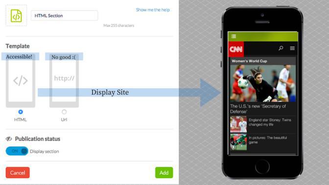 En primer lugar, cabe mencionar las secciones HTML. Las secciones HTML se pueden usar para conectar una página web como fuente de contenido de la app o una funcionalidad que hayas desarrollado. Al agregar una sección HTML, te aparecerán dos opciones: 1) Usar una URL como plantilla (es la opción según la cual debes copiar y pegar la URL de tu sitio web y así éste aparecerá en la app); 2) Usar una plantilla HTML (se trata de la opción avanzada a usar para desarrollar características personalizadas con código propio). Si creas la sección HTML mediante la primera opción (template URL) el contenido de ésta no será visible sin conexión a internet. No obstante, si escoges la segunda vía, es posible que tus usuarios puedan tener acceso. Ello dependerá de la codificación de la sección.