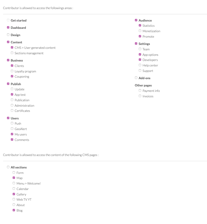 Se pueden asignar derechos de acceso personalizados a cada usuario para cada una de sus aplicaciones. Por lo tanto, si una persona está trabajando en los aspectos más "de diseño" del negocio, puede tener acceso a las funcionalidades correspondientes, mientras que una persona orientada al marketing puede estar limitada a las áreas de notificación y estadísticas.