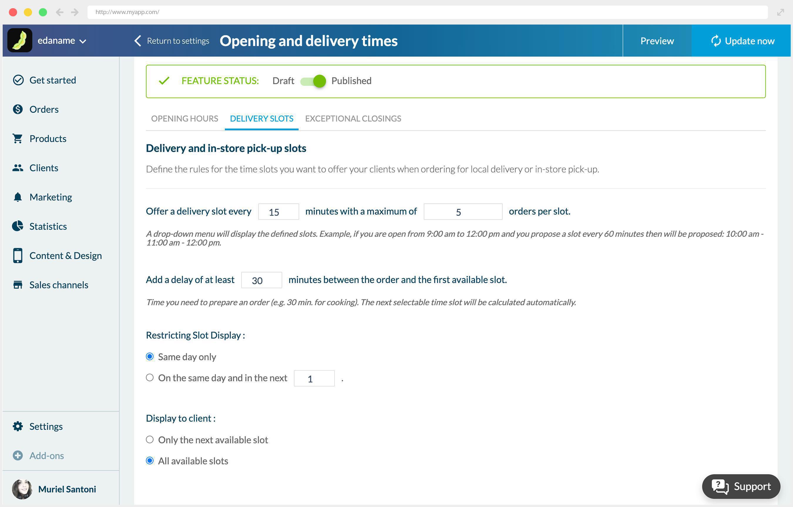 Para garantizar una experiencia fluida, los propietarios decidieron crear espacios de 15 minutos con un máximo de 5 pedidos por espacio. Con el fin de tener tiempo para preparar cada pedido, se ha definido un retraso de 30 minutos entre la hora del pedido y el primer horario de recogida disponible. Por último, los usuarios solo disponen de espacios para el mismo día.