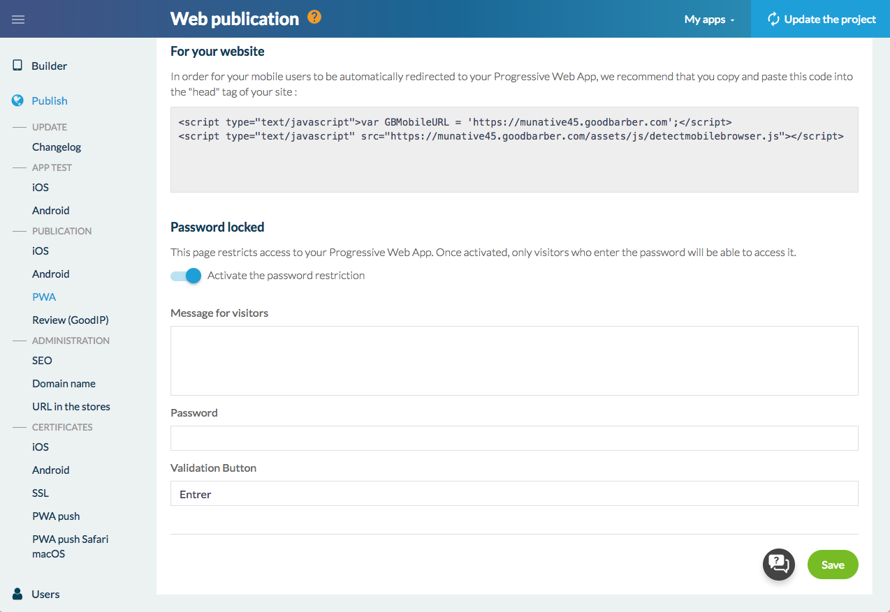 Activando el cierre por contraseña, nuevos campos aparecen permitiéndote crear la contraseña asociada a tu PWA, configurar un mensaje explicativo para los visitantes de tu app, y customizar el botón de acción.