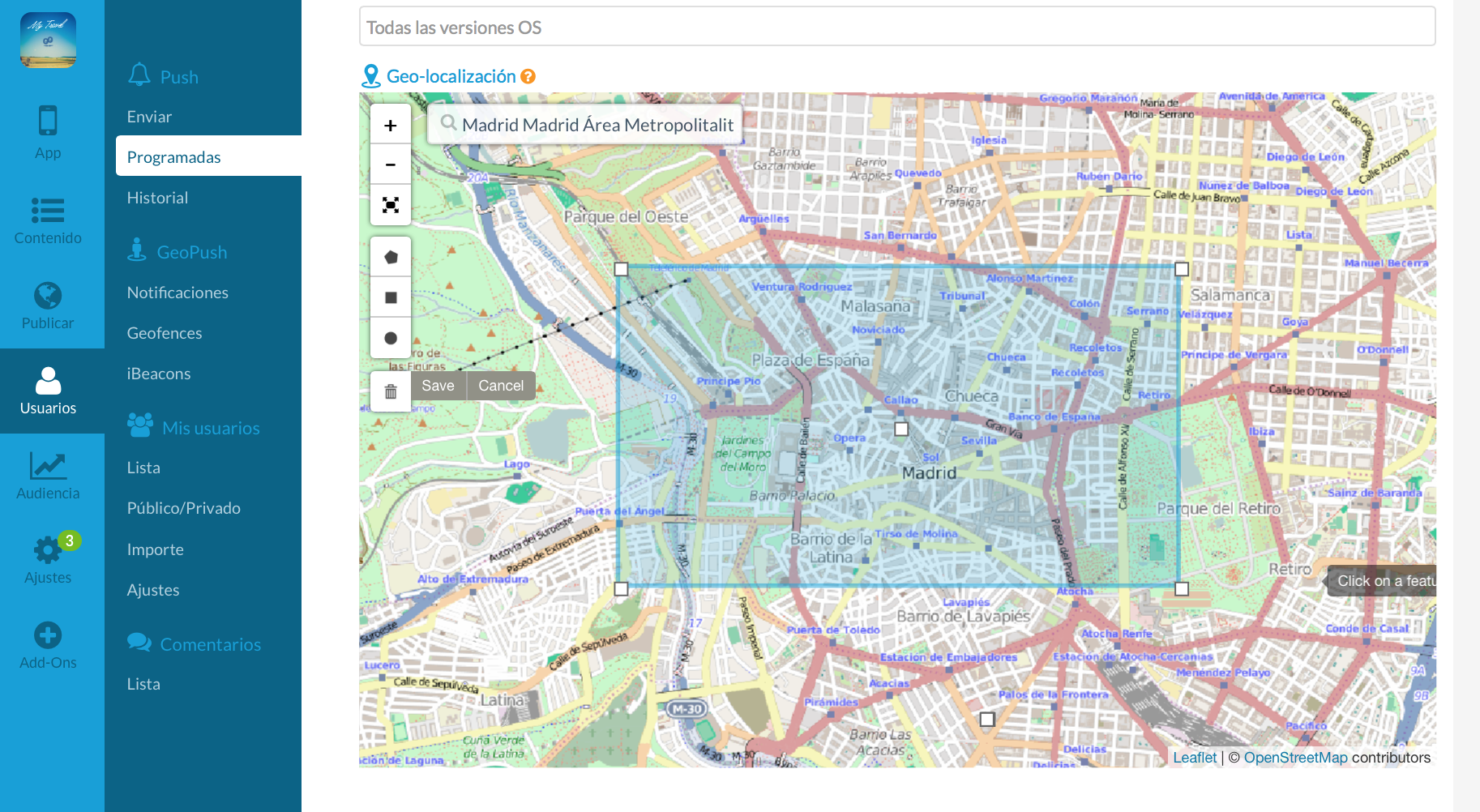 En cuanto a la ubicación, si quieres enviar los mensajes a tus usuarios cuando estén cerca de un punto, por ejemplo tu restaurante, puedes dibujar en el mapa un rectángulo, un cuadrado o una circunferencia y la notificación se enviara durante las horas de apertura o durante una franja horaria que hayas determinado.