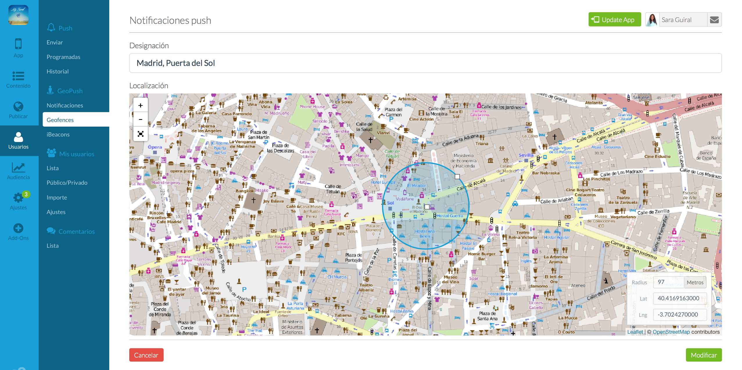 Por ejemplo, tu negocio es una tienda de ropa ubicada Madrid, en la plaza de Callao y defines 3 zonas en las cuales quieres que tus usuarios reciban notificaciones con descuentos y promociones de tu tienda. Estas tres zonas son: Plaza del Sol, Opera y Plaza Callao.