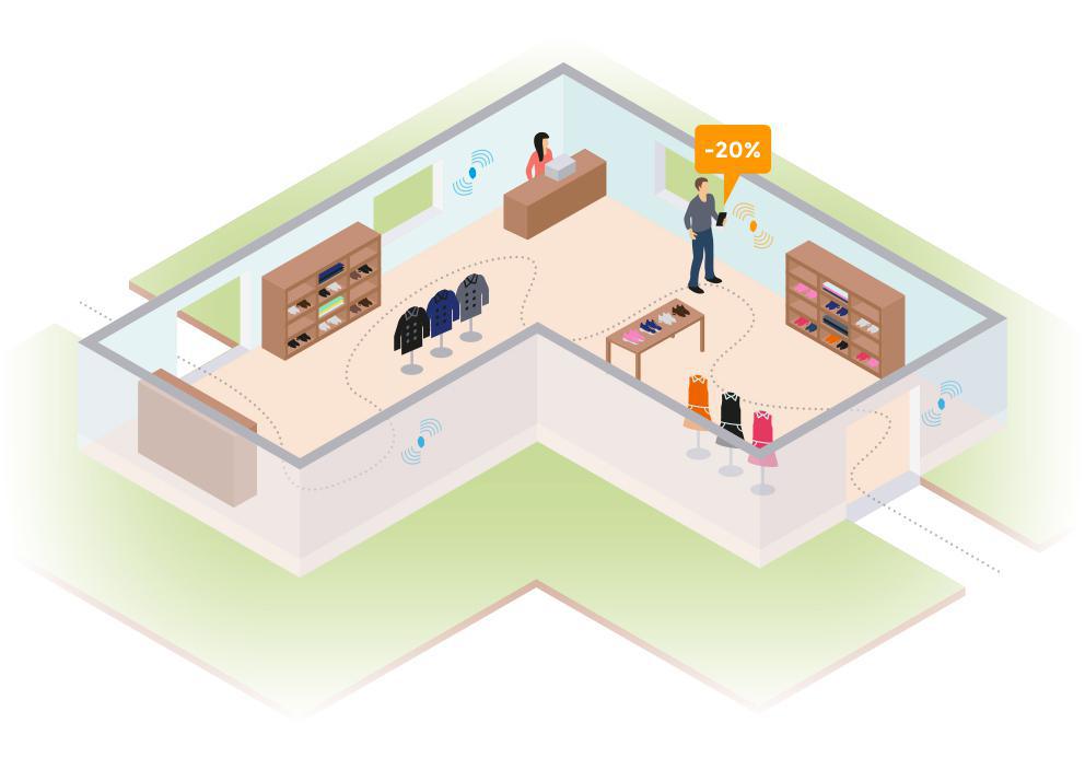 Por ejemplo, en la misma tienda de ropa que comentábamos anteriormente, tienes un conjunto de beacons, los cuales se encuentran dentro de la tienda con el fin de enviar diferentes mensajes a los clientes dentro del área de distribución.