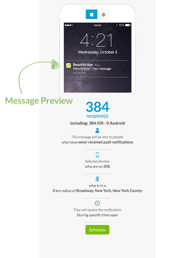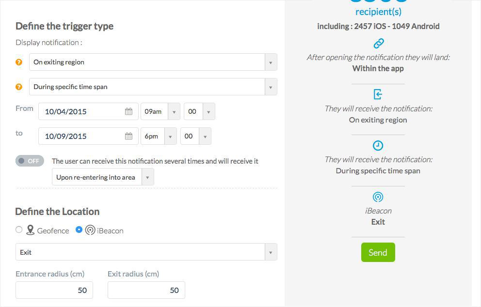 Como en el caso anterior, en tu back office tendrás la posibilidad de seleccionar zonas en las cuales quieres que se entregue la notificación a tus usuarios y podrás decidir cuándo exactamente se enviará.