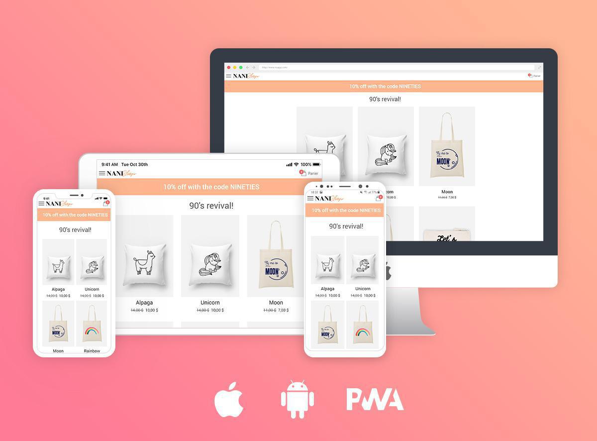 Con GoodBarber, puedes tenerlo todo: una plataforma todo en uno que cubre el 100% del mercado (web, iOS y Android). Tu aplicación nativa te brinda acceso a funciones avanzadas (notificaciones push, acceso a la cámara, geolocalización, etc.) mientras que tu PWA complementa tu aplicación nativa asegurándote que llegue a un público extendido.