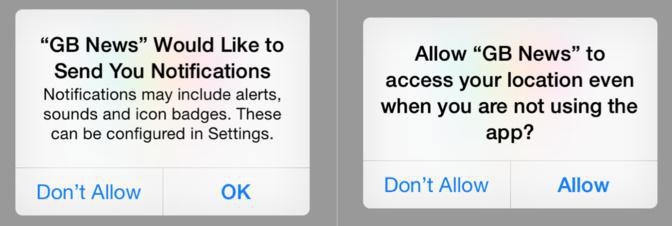 De ese modo, al instalar una app creada con GoodBarber, se te preguntará si deseas autorizar que la app reciba notificaciones push inmediatamente después del primer lanzamiento. Esto ocurre porque la app debería contar con la capacidad de recibir notificaciones push en cualquier momento. Y por el mismo motivo se demanda acceso a datos relacionados con la localización del usuario: para poder geolocalizarlas antes de su envío.