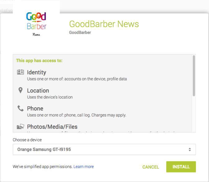 Resulta interesante que, la lista de permisos para una misma app no es exactamente igual si descargas el archivo .apk directamente de algún sitio que no sea la Play Store. Por ejemplo, al probar tu aplicación antes de publicarla. Dicha lista cuenta con mayor cantidad de detalles que la de la Play Store. Quizás esto se deba a que Google prefiere que los usuarios sean especialmente cautos al instalar (hasta ahora) apps sin aprobar, puesto que pueden portar malwares (virus) si se descargan de fuentes desconocidas (obviamente, no, si se descargan de GoodBarber). Así es la página de petición de permisos en este caso: