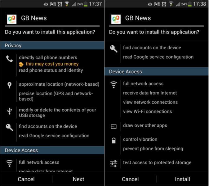 - Modificar o eliminar los contenidos de tu almacenaje USB y Prueba del acceso al almacenaje protegido: ambos suenan bastante sospechosos, pero en realidad sólo se refieren a la posibilidad de almacenar contenido de la app a escala local, en lugar de recuperar el contenido desde servidores cada vez que resulte necesario. Esto tiene dos ventajas importantes: la app es mucho más rápida y el contenido previamente guardado puede consultarse sin estar en línea.