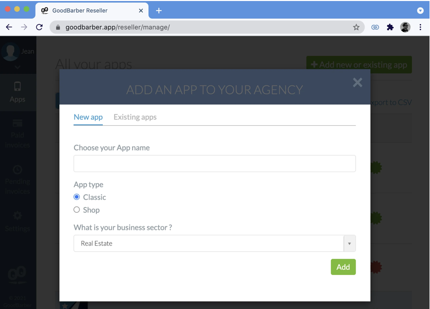 También puedes importar uno existente. Para hacerlo, debes tener una aplicación GoodBarber creada con el mismo correo electrónico que utilizaste para crear tu cuenta Reseller. Haz clic nuevamente en "Añadir una app nueva o existente", ve a la pestaña "Aplicaciones existentes", abre el menú desplegable y selecciona la aplicación que deseas importar a tu cuenta Reseller.
