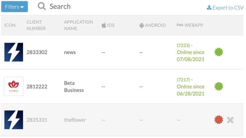 También puedes optar por desactivar una aplicación haciendo clic en el botón verde a la derecha de la aplicación. Al hacer clic en "Continuar", el botón se volverá rojo. Si desactivas una aplicación, no podrás utilizarla. Incluso si ya se ha publicado en las tiendas, una vez abierto, aparecerá vacío de contenido. Para reactivar instantáneamente una aplicación, simplemente haz clic en el botón rojo y haz clic en "Continuar".
